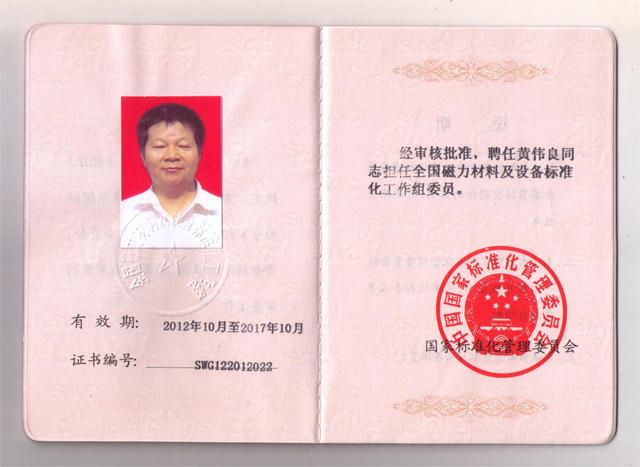 全國磁力材料及設(shè)備標(biāo)準(zhǔn)化工作組委員證書